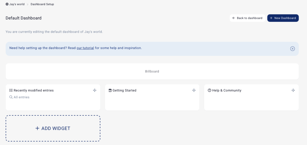 The default dashboard setup for your first campaign includes the Billboard, a Recently modified entries list, a Getting started todo list, and a Help & community helper.