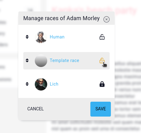 Clicking the pencil icon opens up a new popup, which allows you to re-order the character races, and toggle which ones are public or private by clicking on the lock icon.