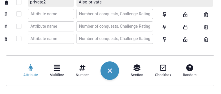 At the bottom, the buttons to add attributes of different types are now always visible once the big “plus” button is clicked. Random attributes are now also available on all entities, not just templates, and will save a value when saved.