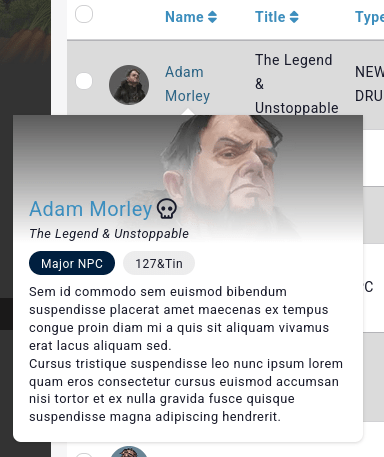 Tooltips have been redesigned in several ways. Firstly, showing the entity’s image is no longer an option only for premium campaigns, but is now always on for all. Secondly, the tooltip now shows a skull if the entity is a dead character. Tags now also display in a nicer way. Lastly, they now lists up to 1000 characters on premium campaigns instead of 500, and the html markup of links no longer count towards the limit.